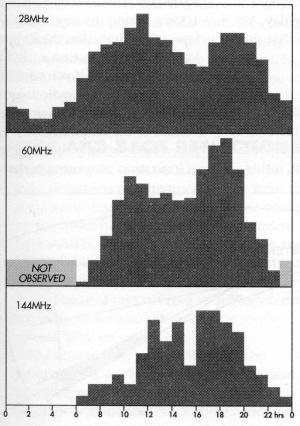 Sin embargo, se producen algunas aperturas de esporádica-E a mitad del invierno con poca relevancia estadística. En cuando a su aparición a lo largo del día, aunque se observan casos desde el amanecer hasta el anochecer, se observa un máximo media mañana seguido de otro a media tarde de mayor intensidad. A medida que la frecuencia de operación aumenta, disminuye la probabilidad de aparición de la esporádica-E así como su duración. En 28 MHz es frecuente observar aperturas de 24 horas de duración mientras que en 144 MHz es difícil encontrar una que dure varias horas. Por otro lado, las aperturas tienden a producirse repetidas veces entre las mismas ubicaciones, e incluso, en días sucesivos. Estudios estadísticos concluyen que si un determinado día se produce una apertura de esporádica-E entre dos ubicaciones, existe una probabilidad del 30 % de que se repita al día siguiente, y un 10 % al tercer día.