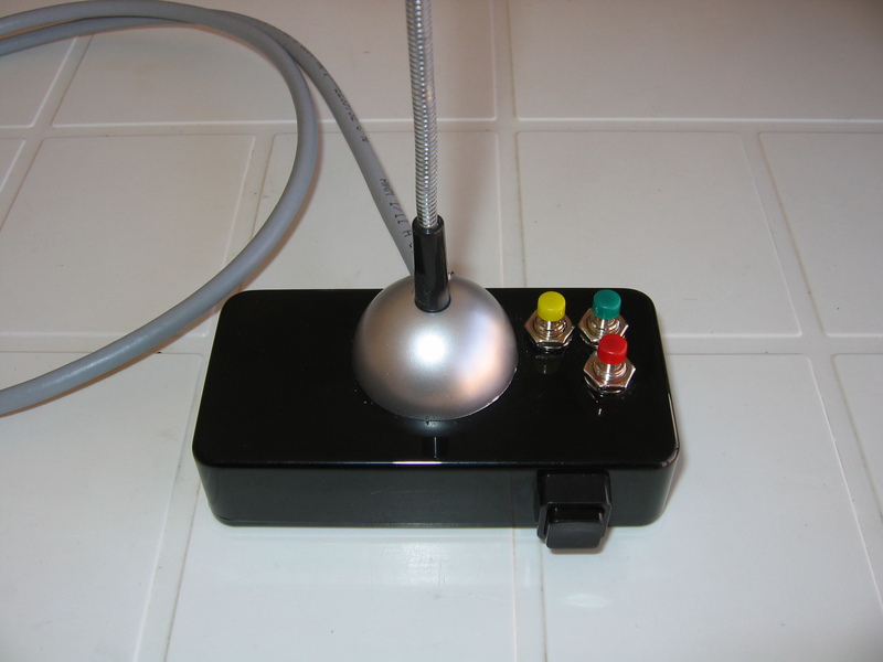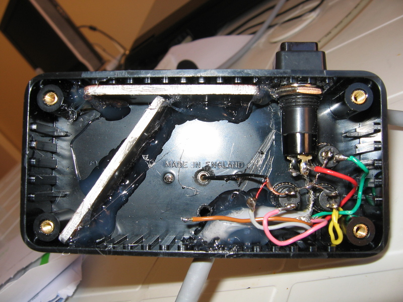Aunque podríamos perfectamente comprar una cápsula de micrófono de tipo electret y realizar con ella este circuito, me ha parecido interesante aprovechar un barato micrófono para ordenador que abunda en las tiendas del ramo. De este modo aprovecharemos tanto la cápsula como la estructura que la soporta. En mi caso he despreciado la base pues se me quedaba un poco pequeña para albergar los interruptores. La he sustituido por una pequeña caja de plástico. En las fotos se aprecian unas masas metálicas pegadas con pegamento de pistola. Dichas masas se encontraban en el micrófono original y las he colocado para mejorar la estabilidad de la caja.