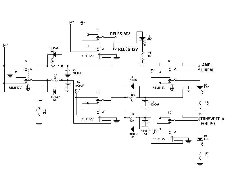 El funcionamiento es el siguiente. En RX (PTT desactivado) se activan los relés K1 y K3, por lo que enviamos tensión a los relés del previo estando amplificador y equipo desactivados. Para pasar a TX pulsamos S1, K2 se activa inmediatamente cerrando sus contactos. La bobina de K1 se queda sin tensión rápidamente, pues C1 se descarga casi inmediatamente por D2. Ya tenemos los relés en TX. Mientras tanto C2 se carga a través de R3 activando K4 a los 80 milisegundos. K3 se desactiva imediatamente cerrando los contactos del amplificador lineal. Igual que antes, K5 se activa a los 80 ms poniendo en funcionamiento el transverter o el equipo .