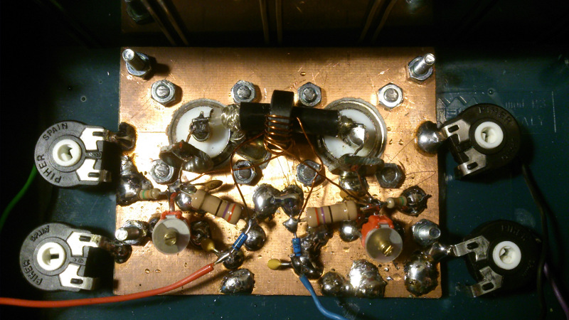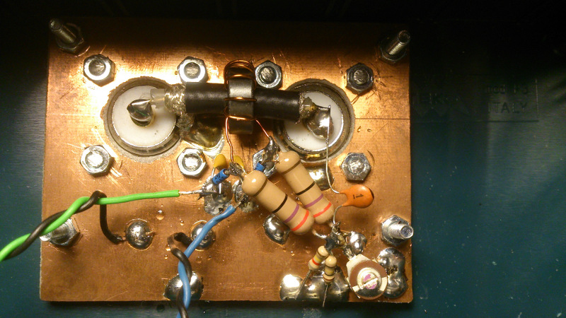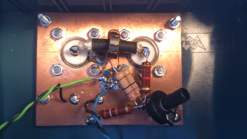I built the circuit using the good ugly construction technique over a copper PCB. In the following pictures you can see the building procedure. Coaxial braid is grounded at TX side only. This acts as a faraday shield in order to prevent capacitive coupling to the toroid winding.