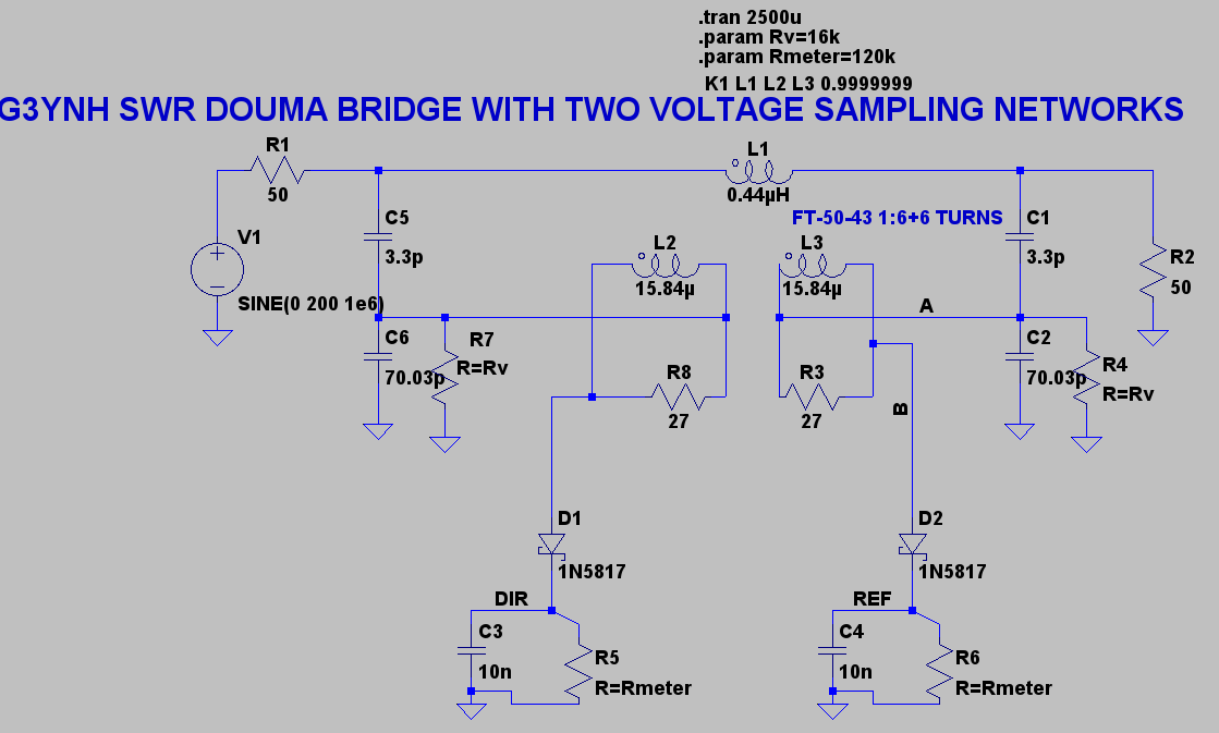 Looking for SWR meter schematics, I found a simple one in the RSGB Radio Handbook. The schematic looked like this: