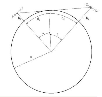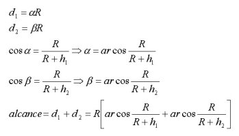 Se observa la situación típica de máxima distancia alcanzable entre dos estaciones. R es el radio de la Tierra, 6371 km. Como se observa, al aumentar h1 o h2, el arcoseno crece y por tanto aumenta d1 + d2. Supongamos que la altura de ambas antenas es h1=h2=100m, la distancia máxima alcanzable sería de 71km. Sin embargo, algo más debe ocurrir para que sean frecuentes alcances de más de 500 km con la instalación adecuada.