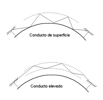 Otro tipo de conductos se forman a mayor altura, cuando hay una doble discontinuidad en el índice de refracción. La onda de radio queda "atrapada" entre esas dos discontinuidades, que típicamente se sitúan entre 450 y 2000m de altura. Dicho conducto actúa como un guiaondas del estilo a los utilizados en microondas, es decir, no propagará ondas cuya longitud de onda sea demasiado grande en relación a la altura del conducto. La anchura mínima del conducto en función de la frecuencia queda reflejada en la siguiente tabla: